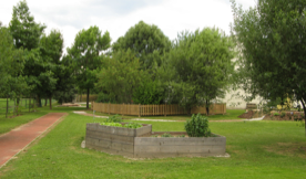 Im Ruhebereich wurde eine Naschhecke mit Beerensträuchern gepflanzt, ein Hochbeet für Gemüseanbau, ein Weidenstrauchhäuschen und ein großer Sitzkreis errichtet. Das vorhandene Biotop wurde eingezäunt, Stauden gepflanzt und die gesamte Anlage mit einer automatischen Bewässerungsanlage versehen.
